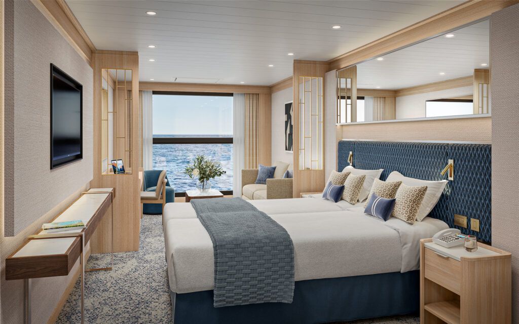 All 112 suites are ocean-facing with no interior cabins, spread across 12 different accommodation types to suit various preferences. The new Infinity Suites feature innovative floor-to-ceiling windows that slide halfway down, creating an open-air feel that’s perfect for enjoying sea breezes.