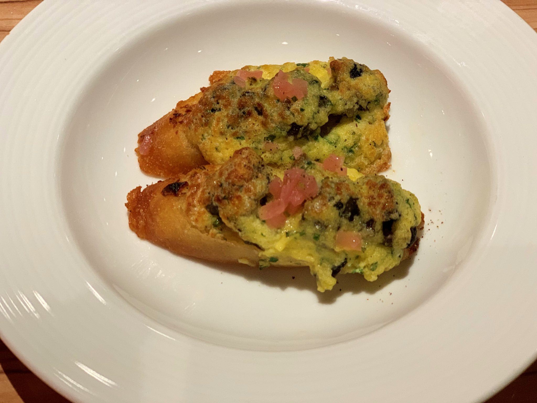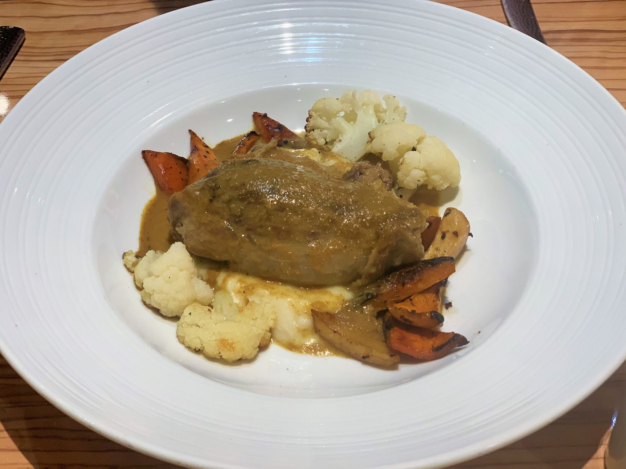 I tried some different options, going with the evening’s “rare finds”, braised rabbit for a starter. For an entree, I ordered the rosemary lamb shank. While different than I expected, it was tender and flavorful. For her meal, the Princess went with the tosdado de pollo inspired by the port of call and the standard chicken breast as an entree.