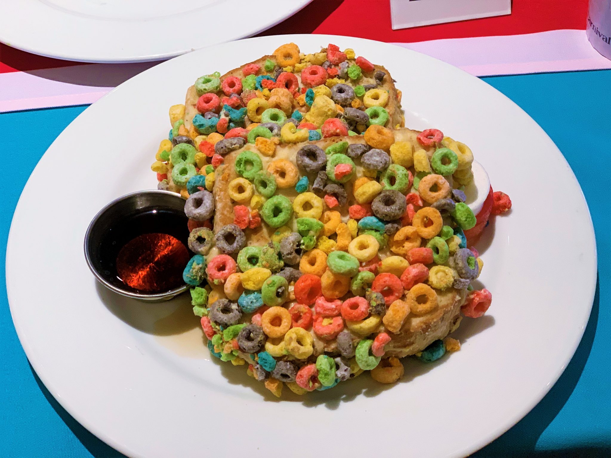 Gaining the hour of sleep, we set the alarm for 6:45 am this morning. On day 1, we made reservations for the ship’s Dr. Seuss breakfast at 8:15 am. I grabbed a few sunrise photos and video of the outdoor decks before getting the wife her morning iced latte.