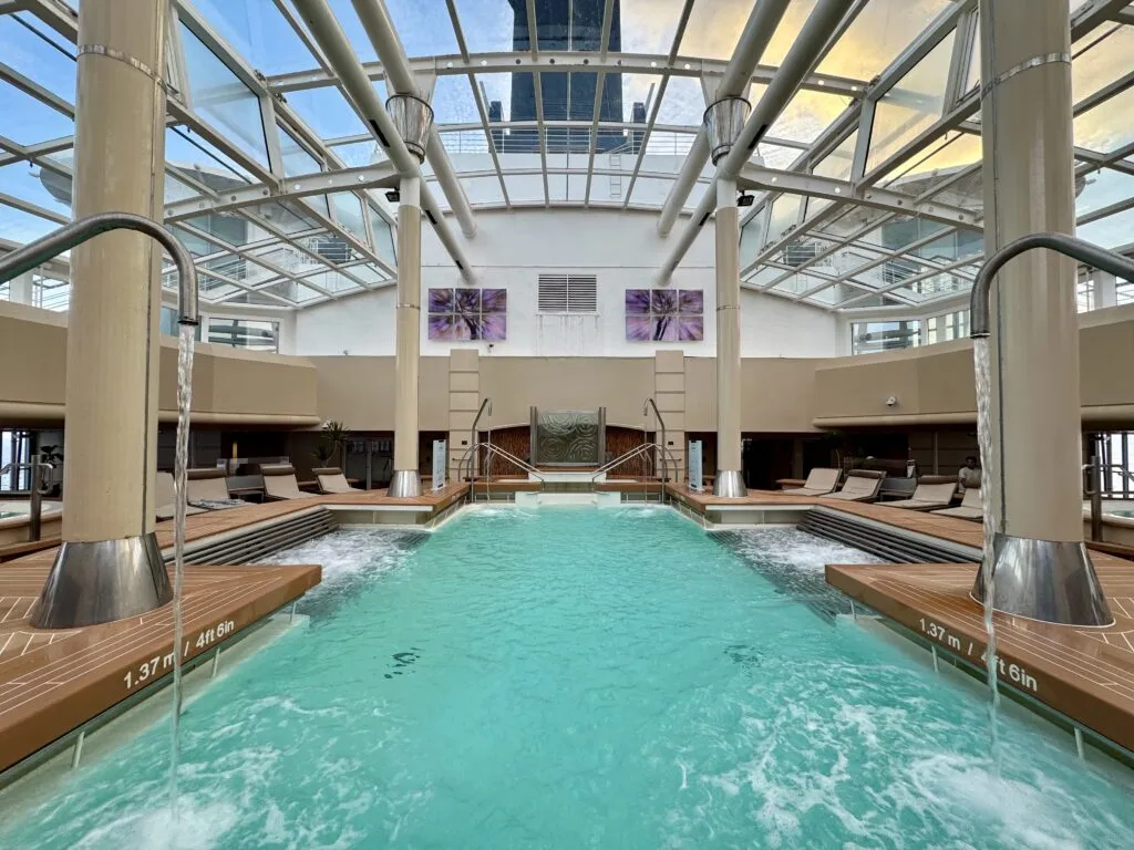 In addition to the main pools, the Solarium is forward on Deck 10. Again, its design felt less than rejuvenating. Further, only one side had loungers, as the starboard side contained tables with chairs for the nearby Spa Café.