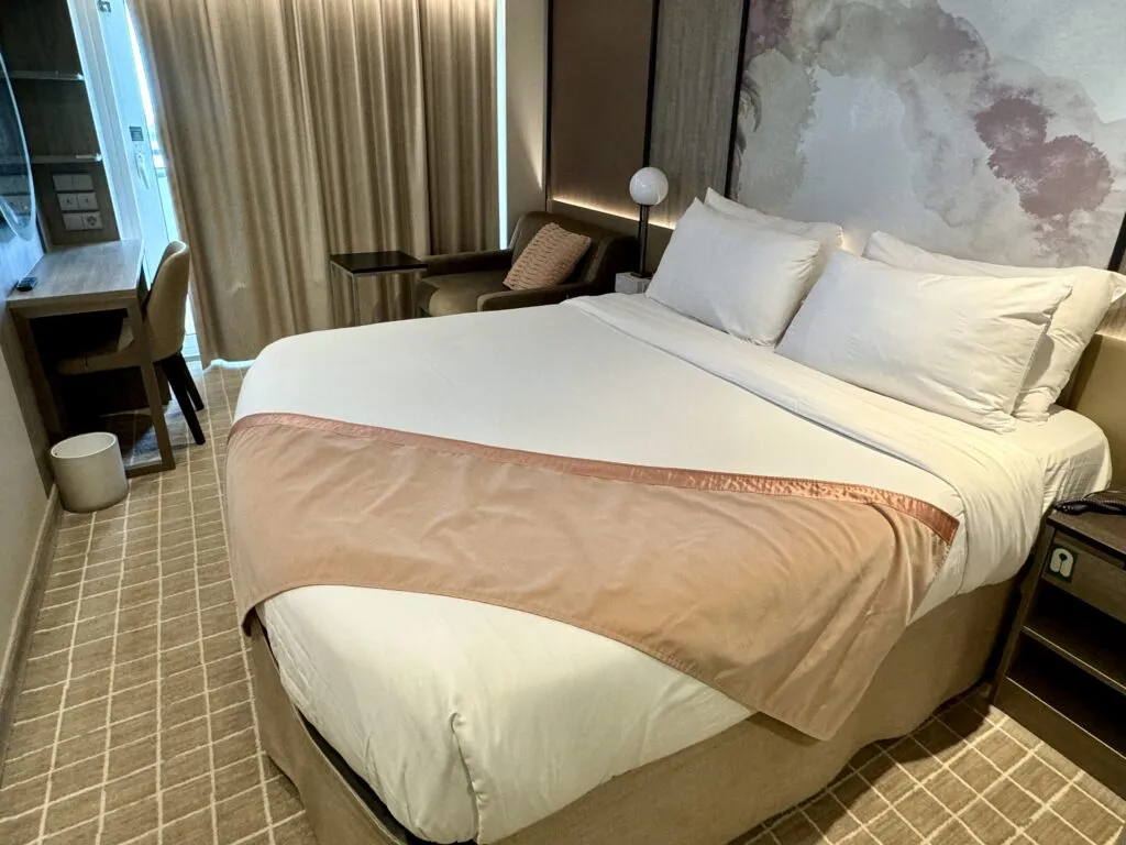 The main cabin area of this Celebrity Summit Veranda Stateroom makes efficient use of space. The queen bed was comfortable and featured signature Celebrity bedding. We had no issues falling asleep after our long days and nights on the ship.
