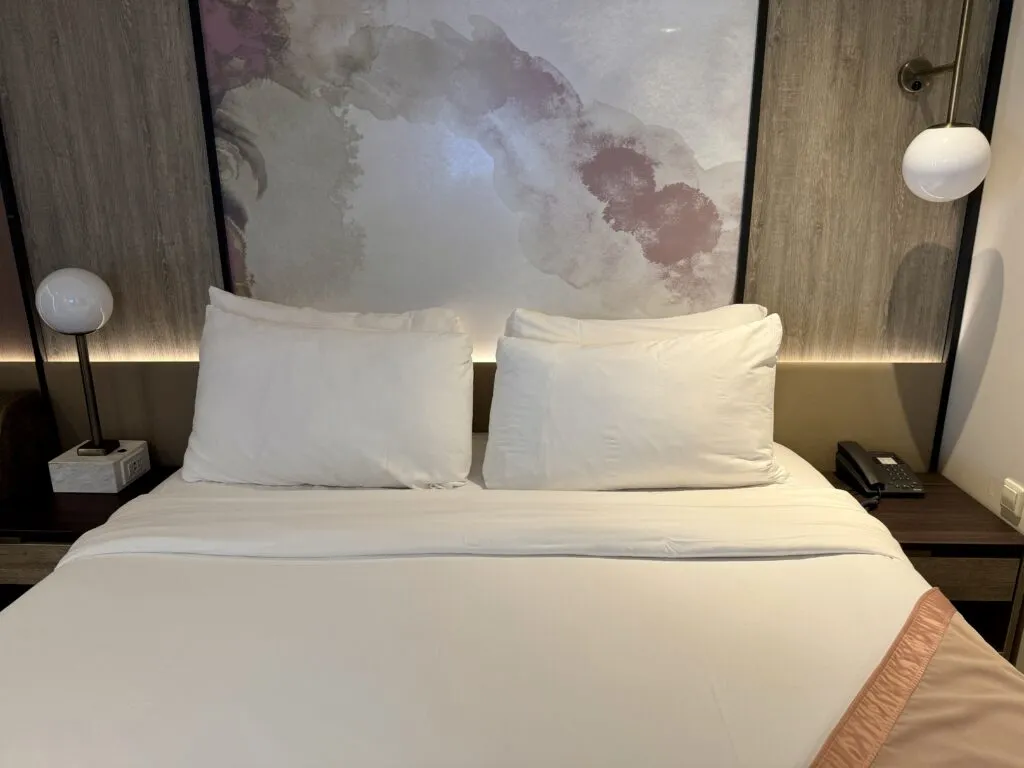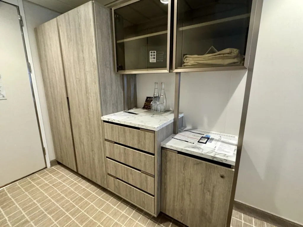 Across from this sitting area, a small desk completes the arrangement. It features four small drawers and two small shelves off to one side. There are also two US and one European power outlet, but no USB or USB-C outlets. Still, it provided a place for me to get ready in the morning and a spot to do a little work in the afternoon when needed.