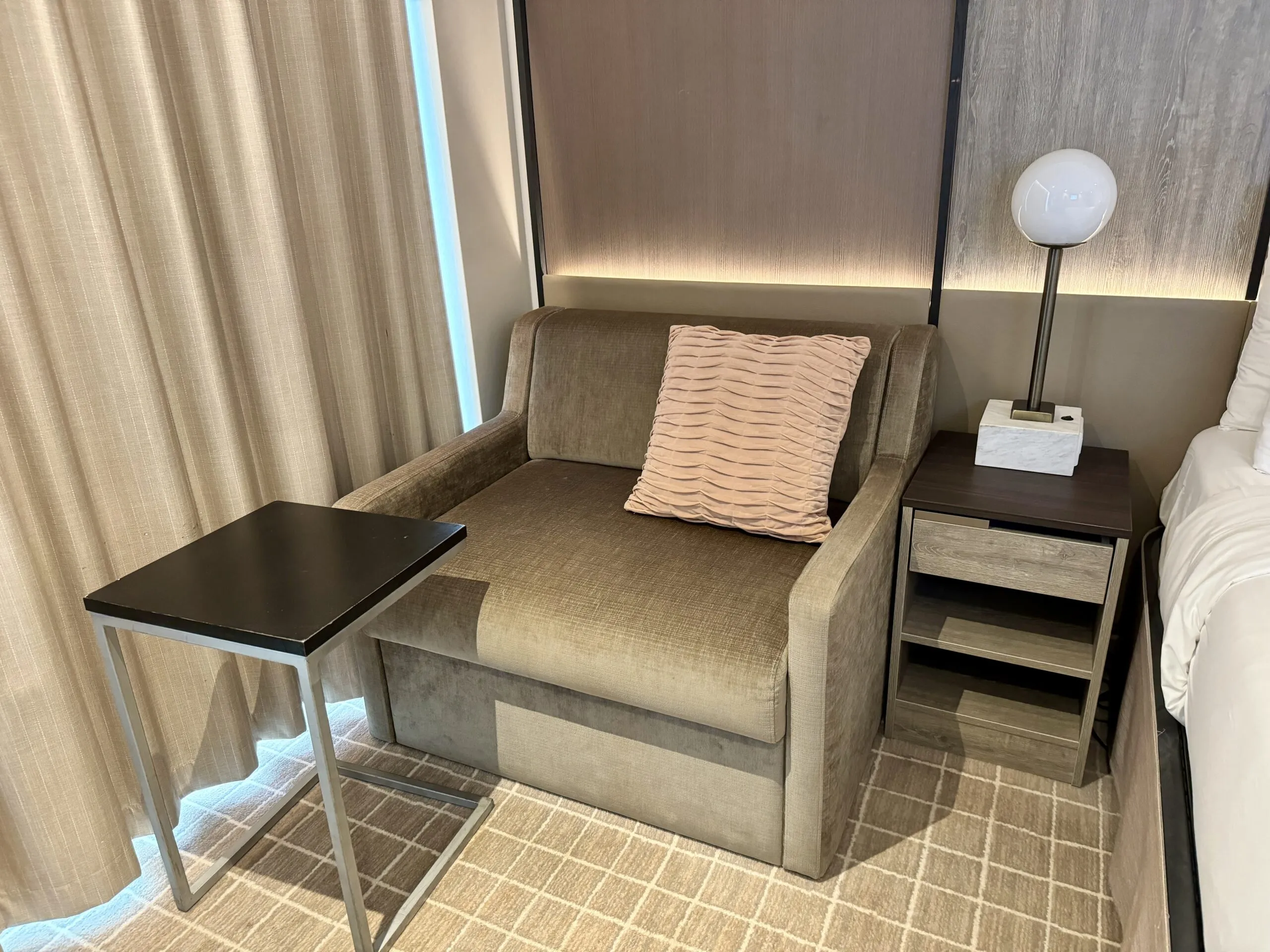 Beyond the bed on the right wall is the sitting area. It includes an oversized chair near the balcony with a small portable table. This is really the only place the smaller cabin size was noticeable. In place of the typical loveseat, this chair was certainly only big enough for one person to sit comfortably.