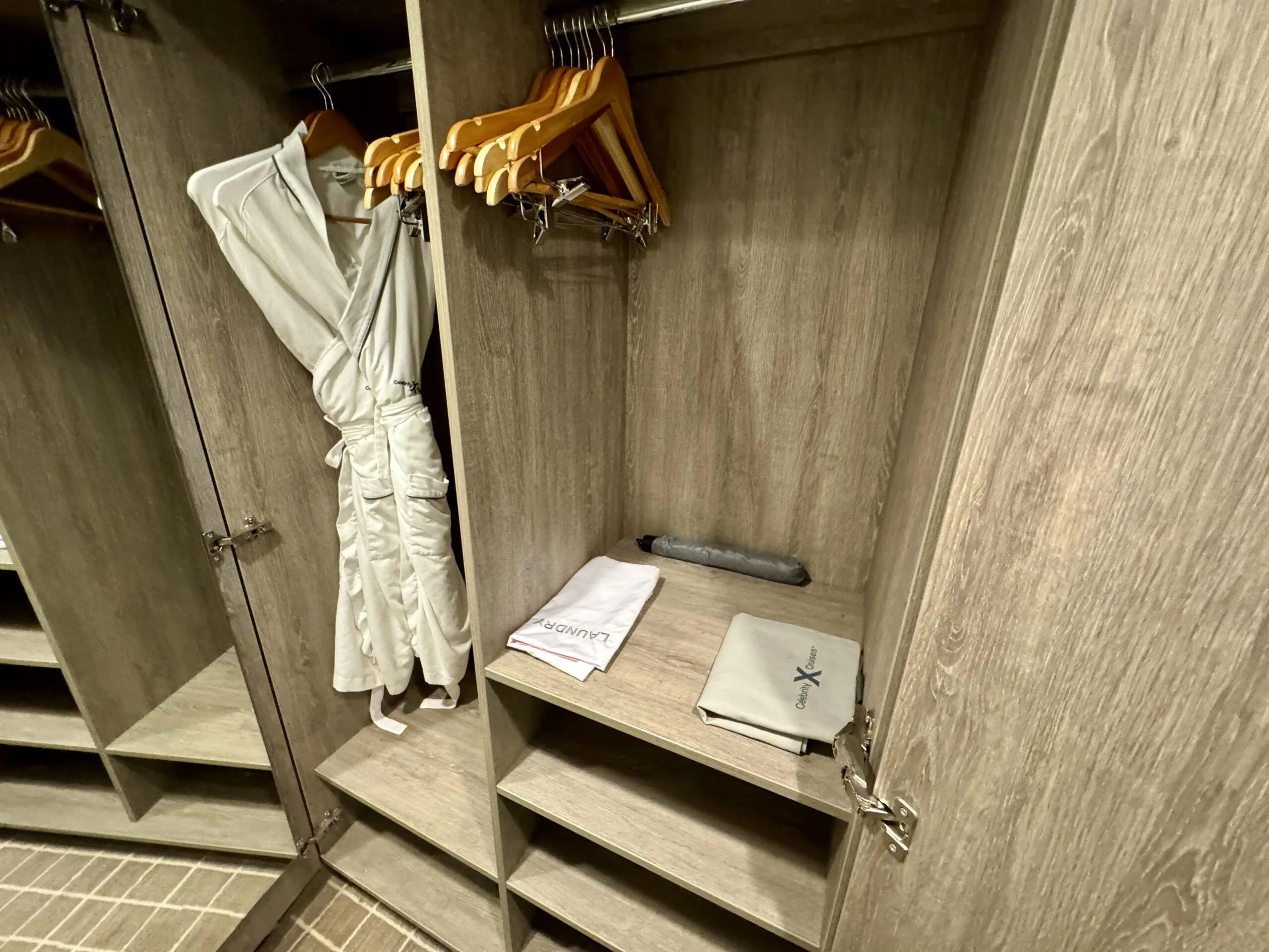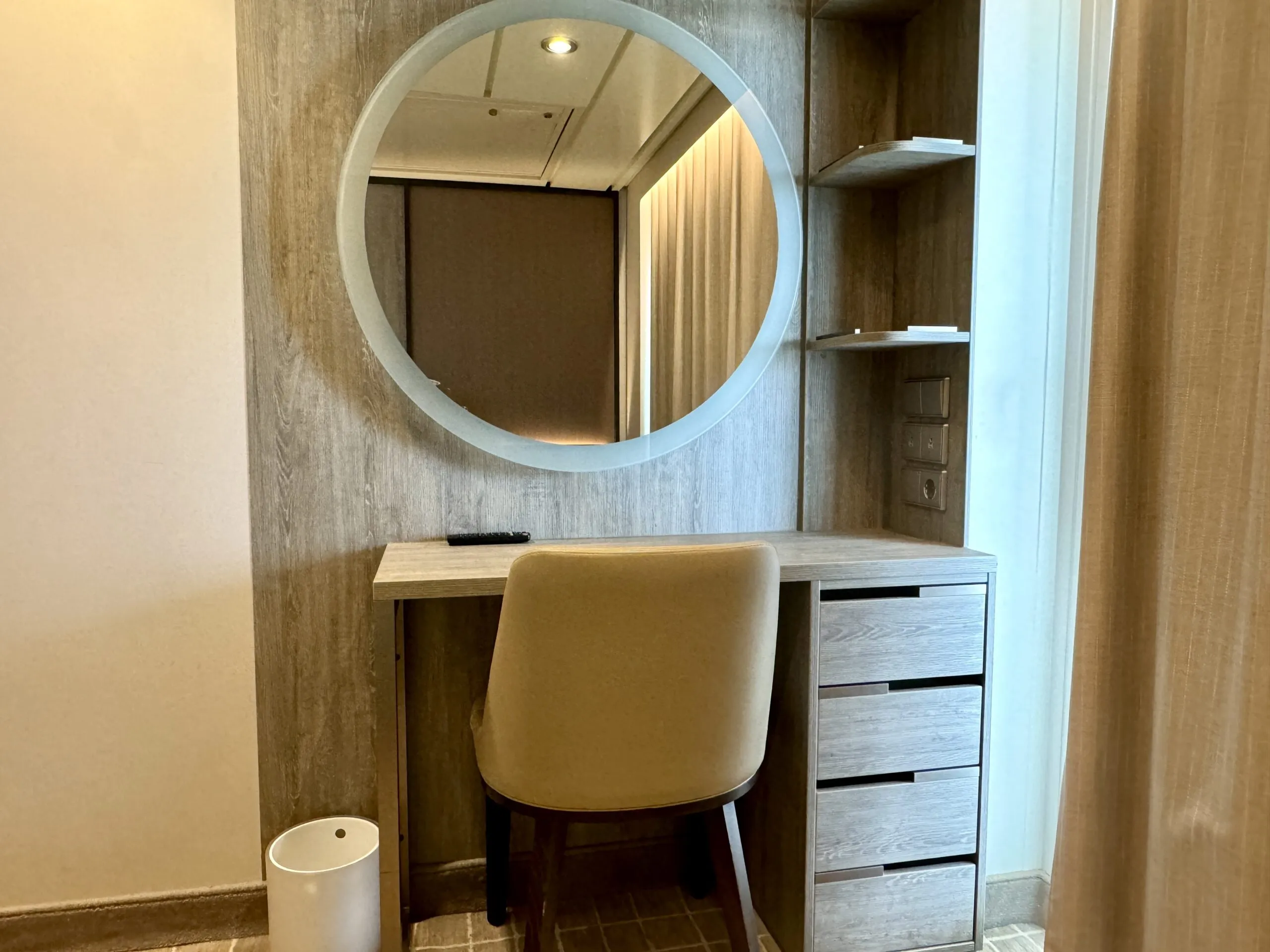 Across from this sitting area, a small desk completes the arrangement. It features four small drawers and two small shelves off to one side. There are also two US and one European power outlet, but no USB or USB-C outlets. Still, it provided a place for me to get ready in the morning and a spot to do a little work in the afternoon when needed.