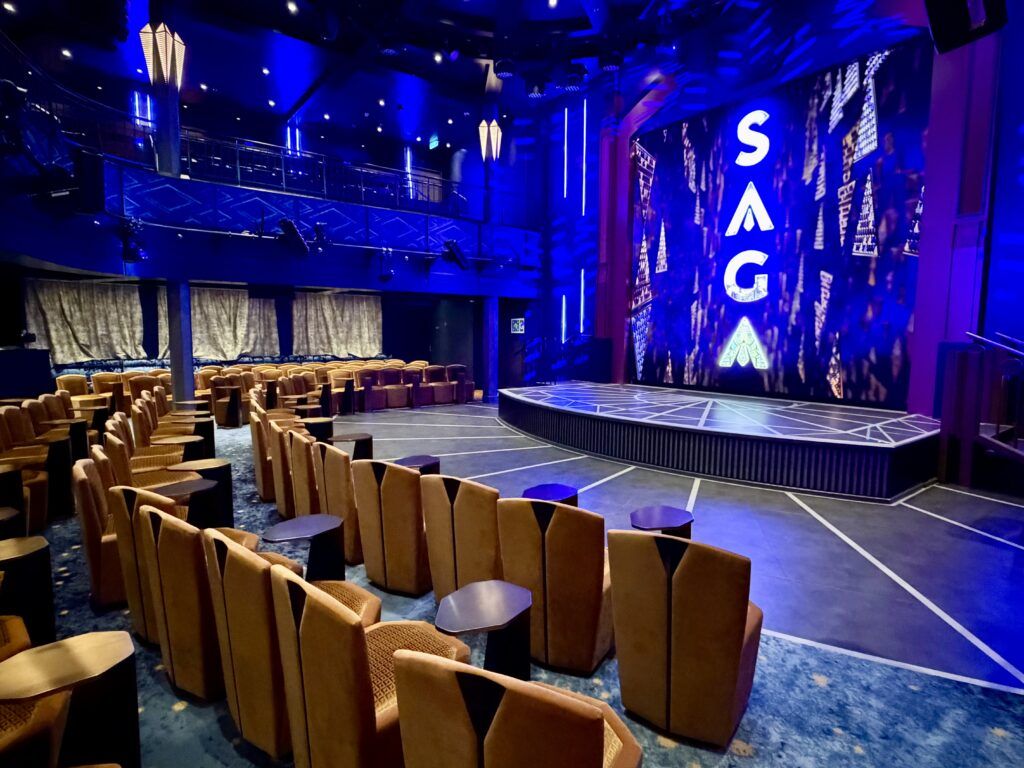 Centrally located on Deck 4, with balcony seating on Deck 5, Saga is a new entertainment venue on Disney Destiny. Inspired by the architecture of Wakanda, Saga hosts a multitude of activities and entertainment throughout the cruise. This theater transforms from a daytime setting for families into an adult-exclusive space in the evenings. It hosts activities like Match Your Mate game show, the Silent Disco, Villain’s Game Night, Under Her Spell: A Maleficent Encounter, and the new interactive With Great Power! A Marvel Comedy Show.