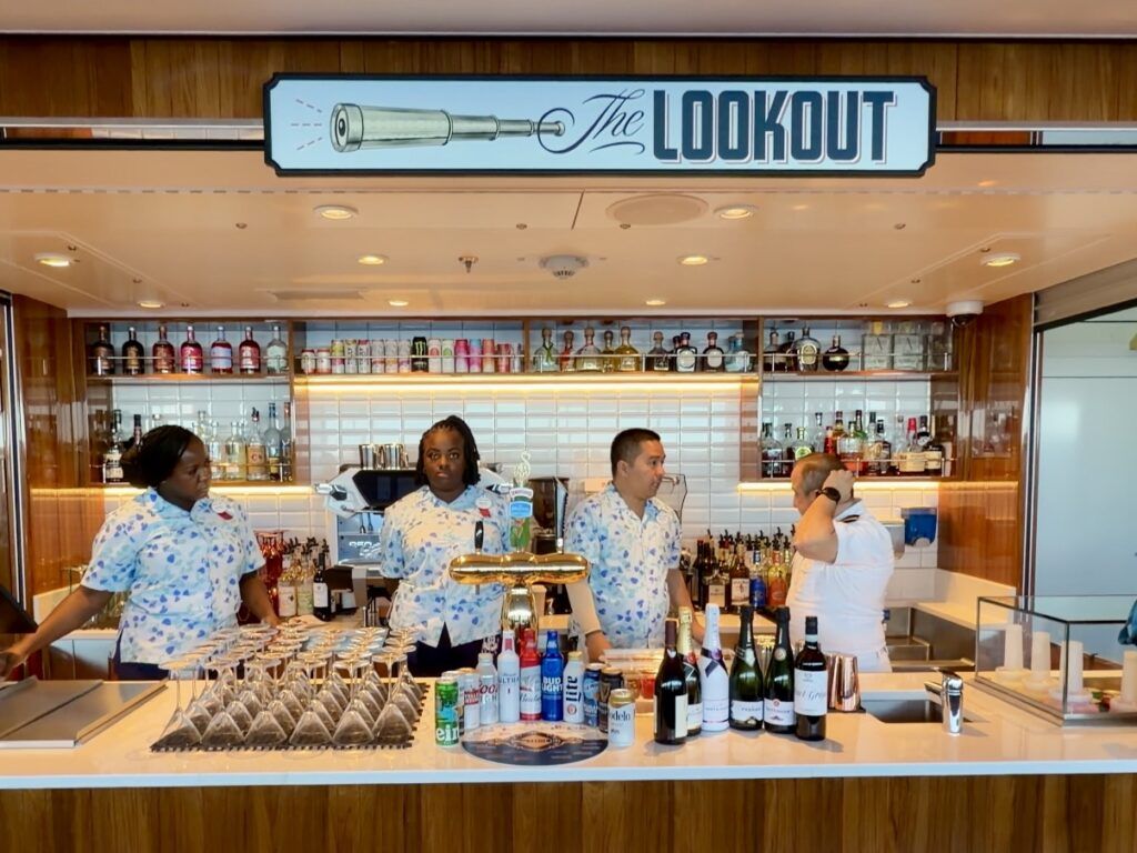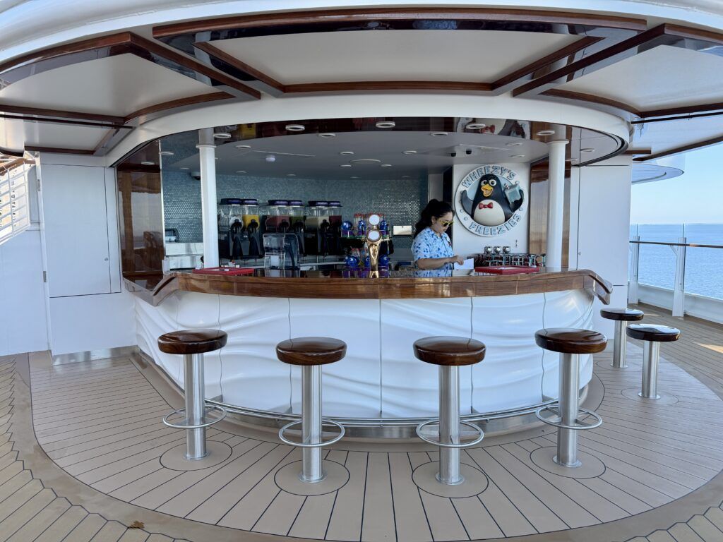 The Lookout Bar is one of the bars on the Deck 11 pool deck. It’s located nearby the Mickey and Friends Festival of Foods quick-service stations.