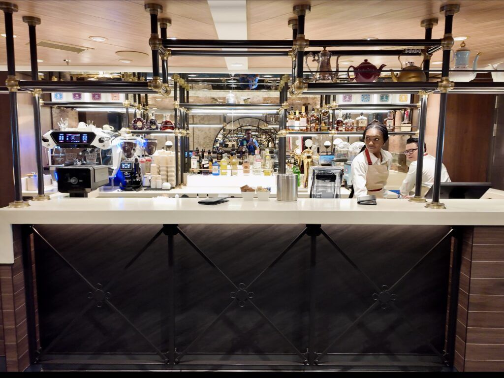 This cafe on Deck 4 is one of the two main specialty coffee venues on Disney Destiny. It serves coffee, tea, espresso-based drinks, pressed juices, cold brew cocktails, wines, Olympian-tinis, and more throughout the day.