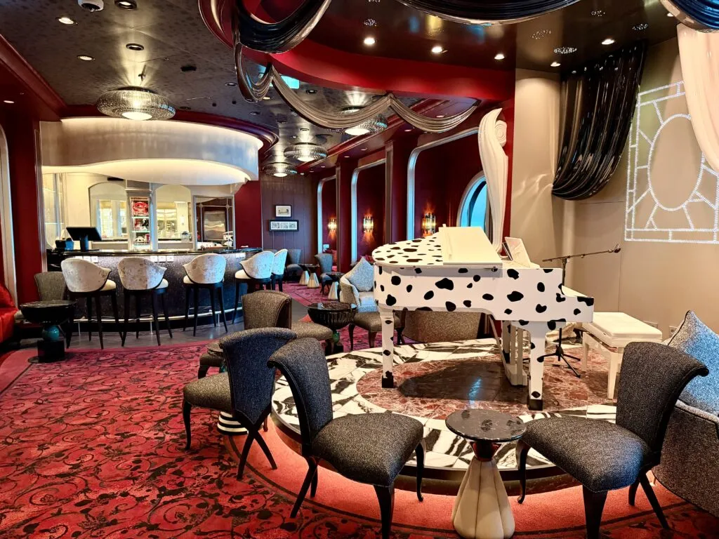 Continuing the villains theme, Cruella has her own lounge on Disney Destiny. Adorned with black, white, and red decor and even a dalmatian-spotted piano, this intimate bar is quite popular for the live music and the drinks. The cocktails here are just as over-the-top as the diva herself, with drinks like the Fashionista poured from a spotted shaker and served with a side of popcorn, to the Perfectly Wretched topped with champagne perfume and a side of lipstick, to the zero-proof Fearless Sir Galahad with aromatic smoke.