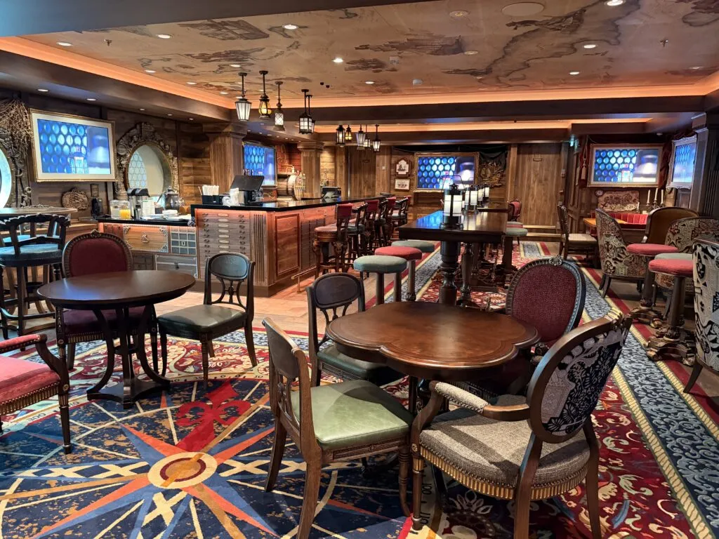 The third fully re-themed bar on Disney Destiny is Cask & Cannon. This Pirates of the Caribbean-inspired bar is a hit with lots of nods to the classic Disney Parks attraction. Like the pubs on other Disney cruise ships, you’ll find televisions playing sporting events, signature brews, some cocktails like the Dead Man’s Chest, and pub bites.