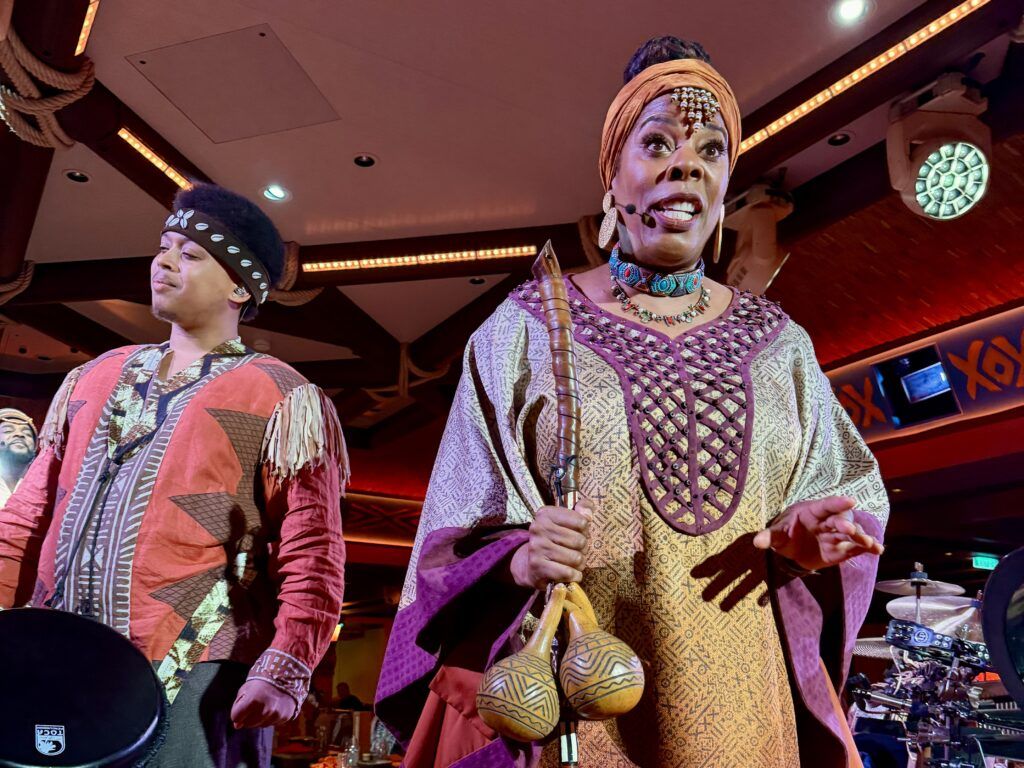 With front row seats, we settled into the 90-minute dinner and a show. The menu features items like Spiced Tomato-braised Lamb Shank, Berbere Spiced Roasted Chicken, Peri-Peri Shrimp, Creamsicle Cheesecake, and drinks like ‘Can You Feel the Rum Tonight?’. For fans of Disney Parks, the food is reminiscent of Sanaa at Disney’s Animal Kingdom Lodge, minus the delicious bread service.