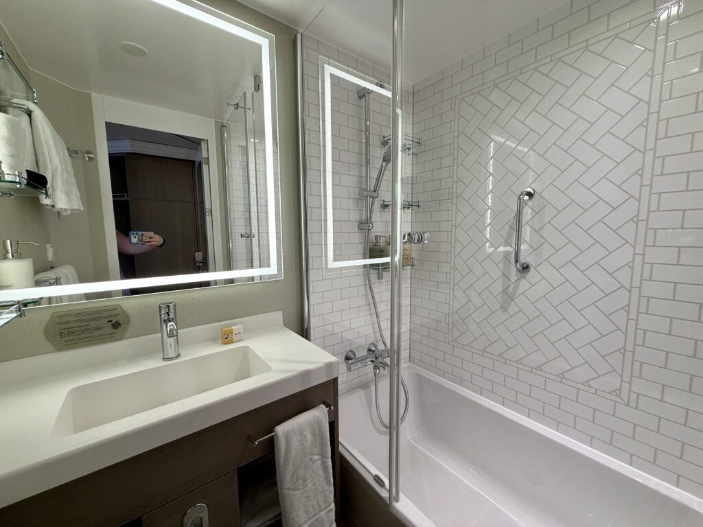 The bathroom in this Disney Destiny Deluxe Family balcony cabin is a nice upgrade from comparable cabins on other cruise lines. It has the typical Disney Cruise Line split bathroom setup which is great for families. This includes a bathroom with a vanity, sink, and shower/tub combo and a half bathroom with a vanity, sink, and toilet.