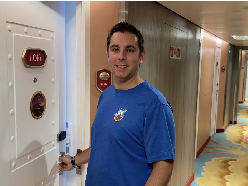 For our first cruise on Disney Destiny, we were sailing as guests of the cruise line and were assigned cabin 11016. Reviewing the deck plans, this portside balcony cabin is a 4A category stateroom on Deck 11. It’s located fairly forward, beyond the forward bank of elevators. Being on Deck 11, this cabin is forward from the main pool deck with casual dining options and the pools located nearby.