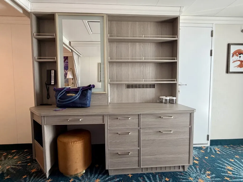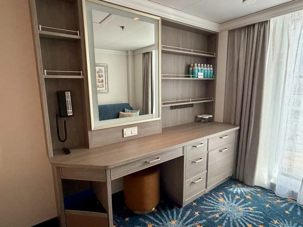 Across the way is the desk. The desk is somewhat larger than what you typically find in a balcony cabin on cruise ships. There are three long shelves and two shorter shelves above the desk for storage as well as five total drawers. Here, you will also find the hair dryer and the mini-fridge.