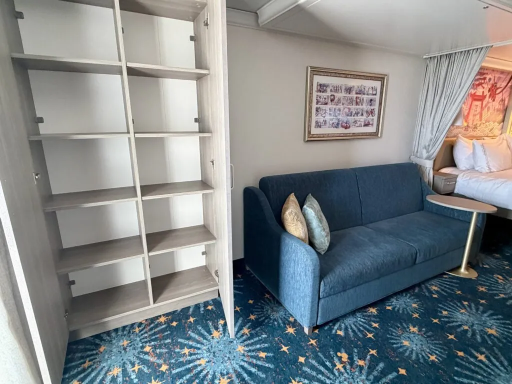 The sitting area is spacious by cruise ship standards and has additional themed wall art. The sofa provided plenty of space for two adults, along with a small end table. It converts to a single bed if needed as well.