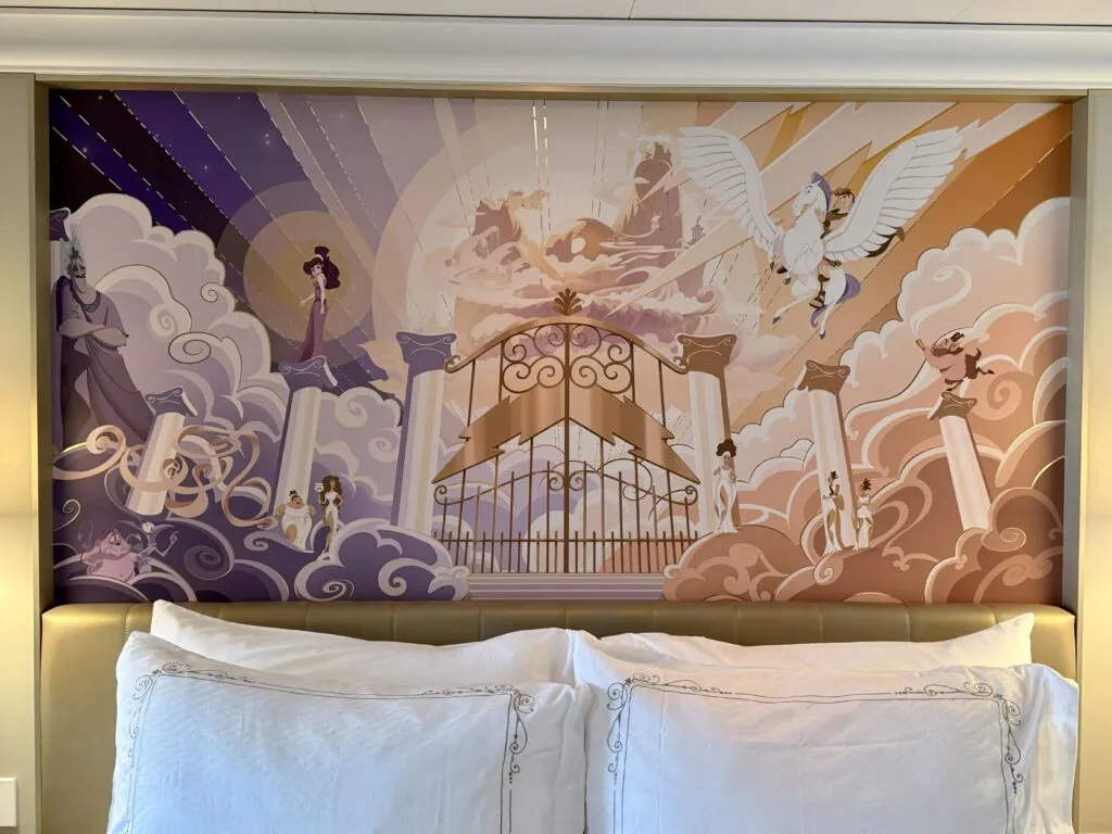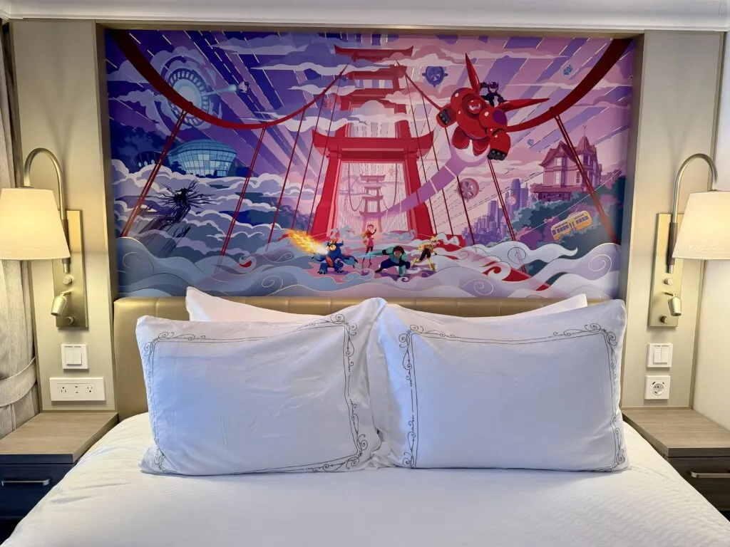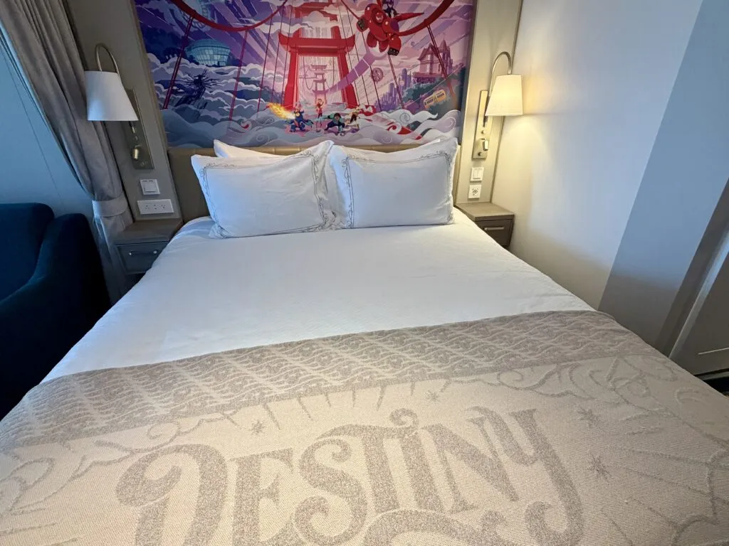 The theming in the Disney Destiny staterooms vary based on location, featuring depictions from popular Disney films including Brave, Raya, Hercules, Mulan, Incredibles, Big Hero 6, and Fantasia. This particular room features Big Hero 6.