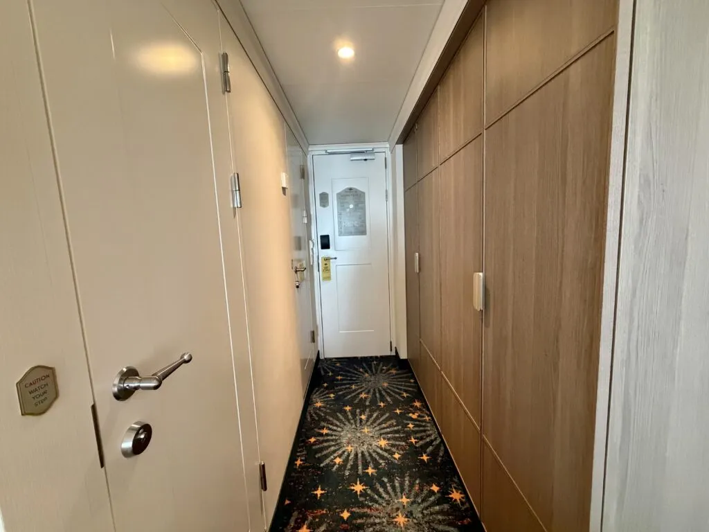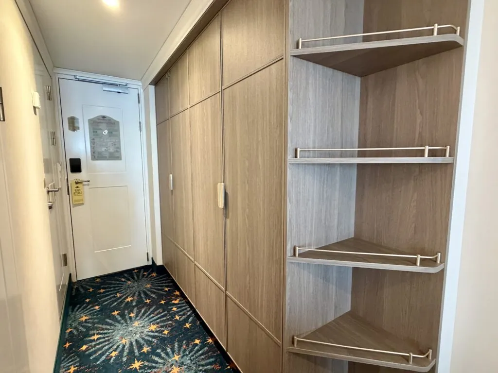 Immediately entering our stateroom, the bathroom was to the left and the closet was to the right. There was also additional corner shelves for storage on the same wall as the closet.