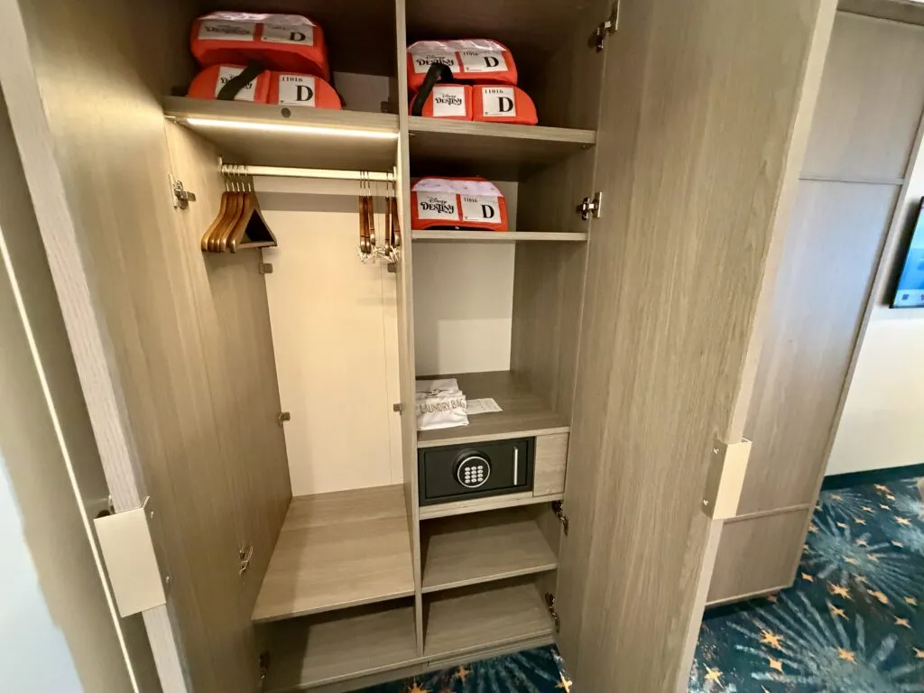 One side of the closet features a small clothes bar and a few shelves as well as the safe. The other features a full clothes bar with hangers. However, there are no additional storage areas in this standard cabin setup. The cabin doesn’t have the series of open shelves tucked around the corner from the closet either.