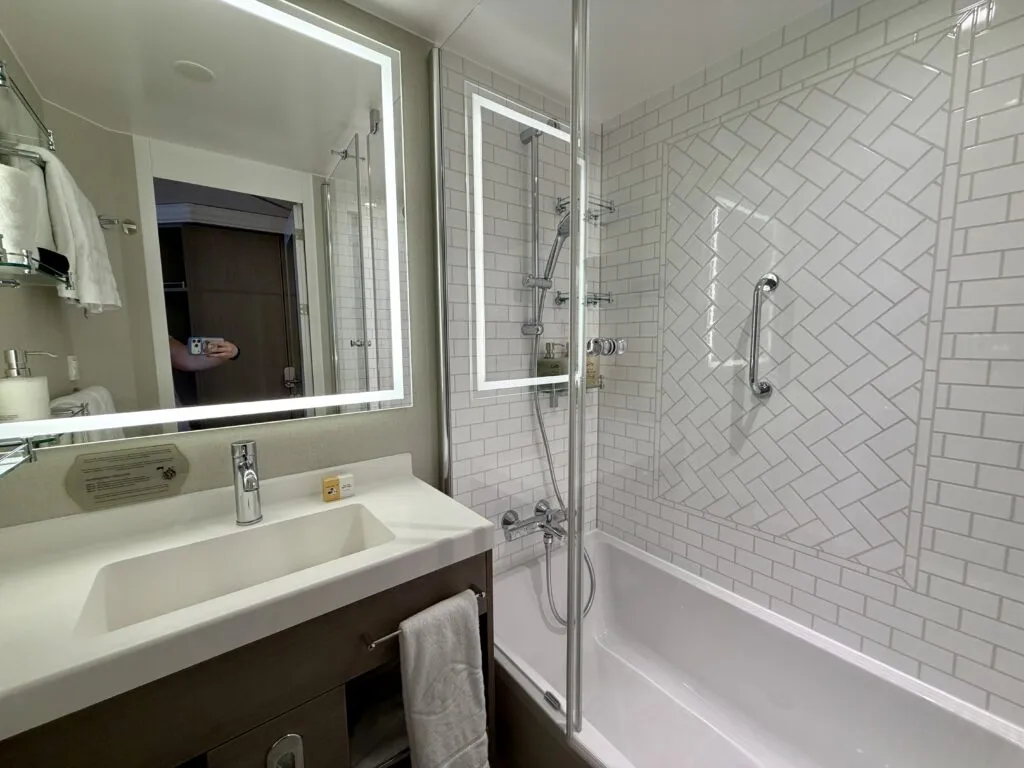 The bathroom in this Disney Destiny Deluxe Family balcony cabin is a nice upgrade from comparable cabins on other cruise lines. It has the typical Disney Cruise Line split bathroom setup which is great for families. This includes a bathroom with a vanity, sink, and shower/tub combo and a half bathroom with a vanity, sink, and toilet.