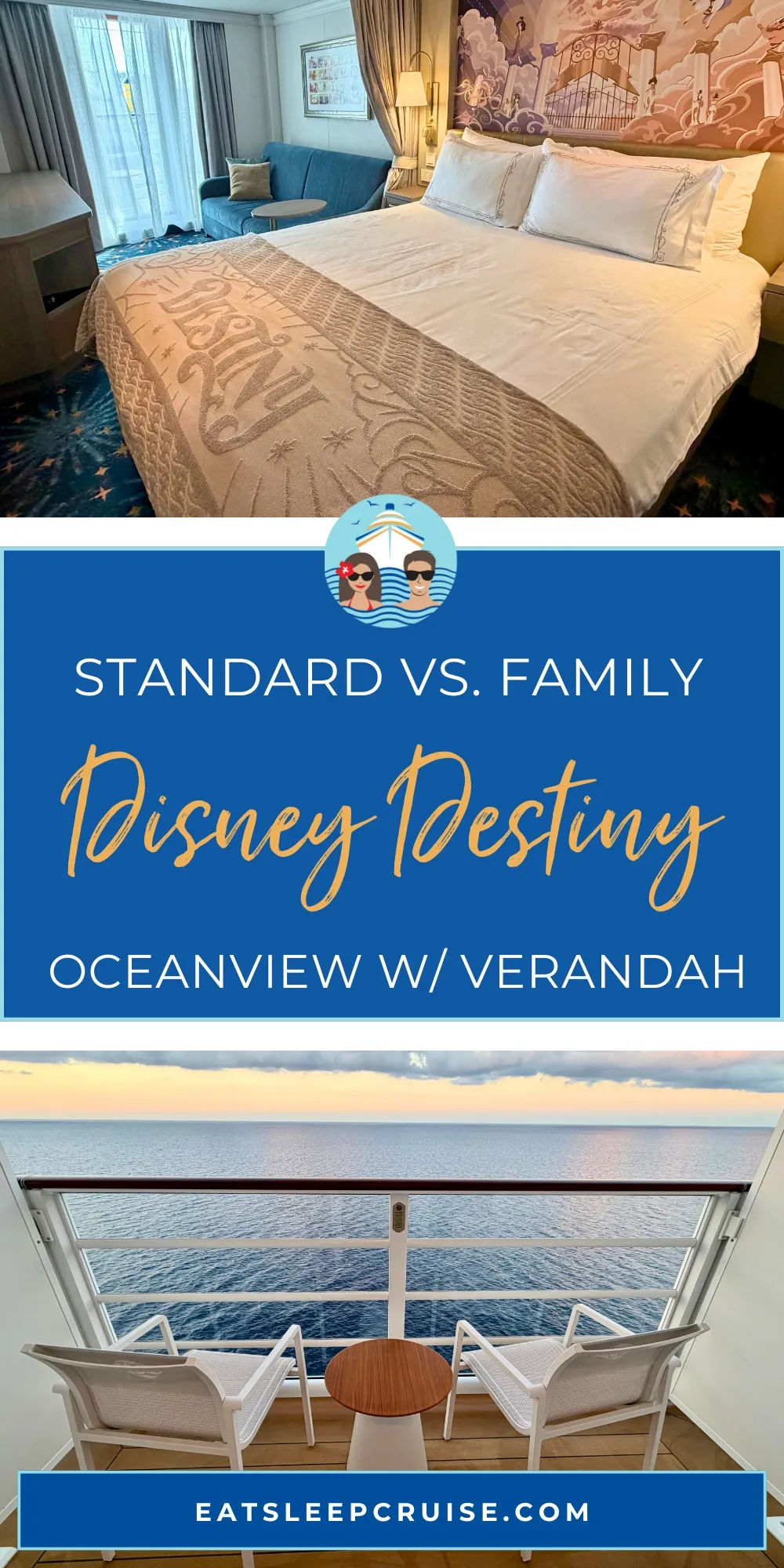 We’ve had the pleasure of sailing on Disney Cruise Line‘s newest ship, Disney Destiny, twice since it set sail. During our first cruise, we stayed in a Deluxe Family Oceanview Stateroom with Verandah, but for our second sailing we booked a Deluxe Oceanview Stateroom with Verandah. How did this standard option compare to the Family version? Our latest Disney Destiny deluxe cabin review and comparison will help you decide which one to choose for your next vacation.