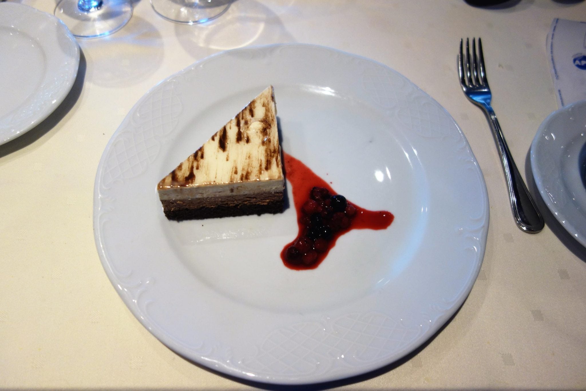 For dinner, the Princess tried the spaghetti carbonara which was prepared with very little cheese sauce and different than she expected. I went with the New York strip cooked medium rare, and it was prepared exactly as ordered. We did order desserts, but barely took a few bites as we had already decided to test out the gelato and pastries in the Piazza after dinner.