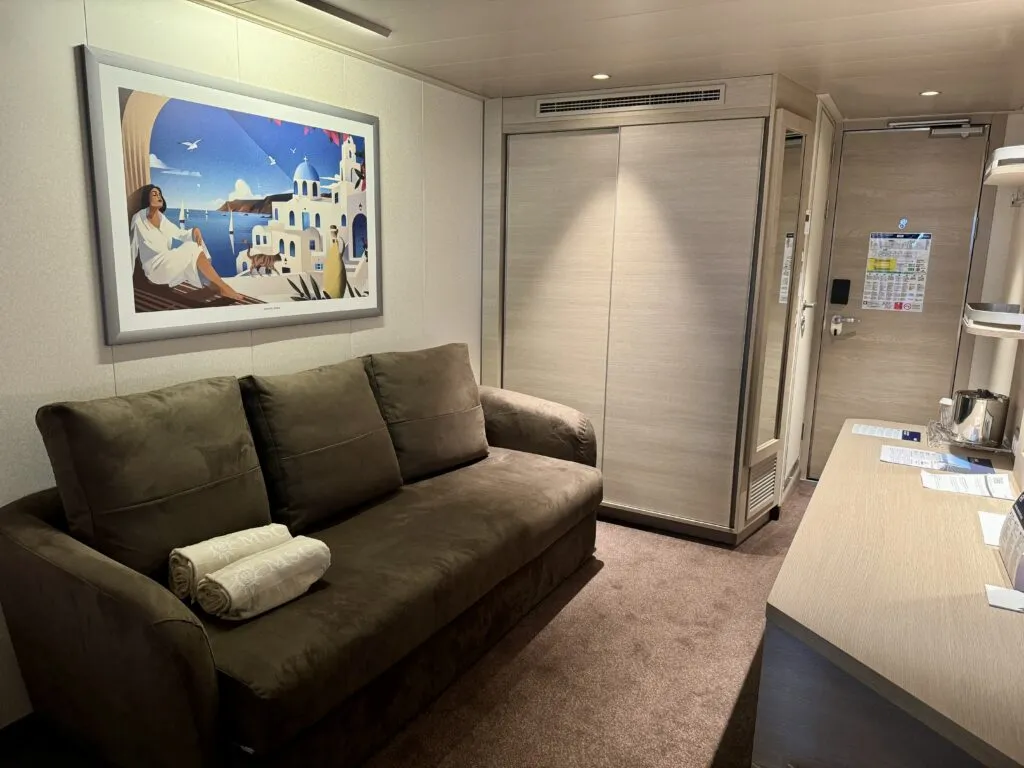 Much like our previous stateroom, the color palette in this cabin is rather subdued, with light wood and lots of brown. The only real color in the cabin was provided by the artwork above the couch, depicting Santorini. Yes, despite being the Seattle deck, there was no reference to Seattle.