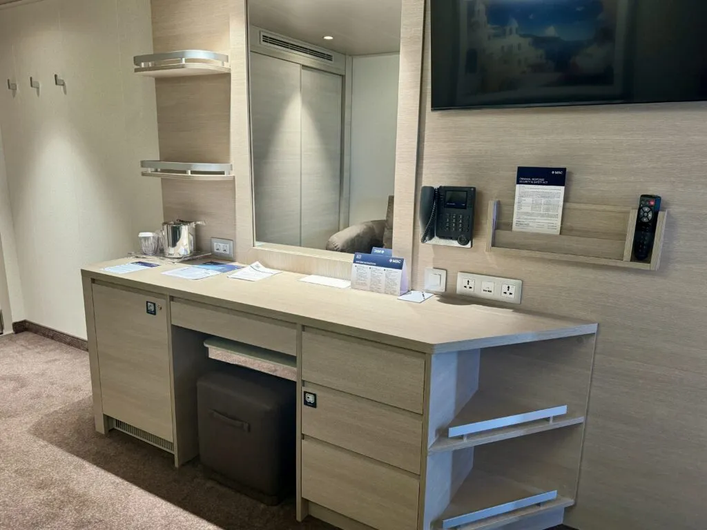 The desk is adequately-sized with two overhead shelves and two additional drawers. The third drawer actually houses the safe. The mini-fridge is located here as well, along with two lower corner shelves near the television. In terms of outlets, there are two U.S. outlets, 2 USB outlets, and 2 European outlets at the desk.