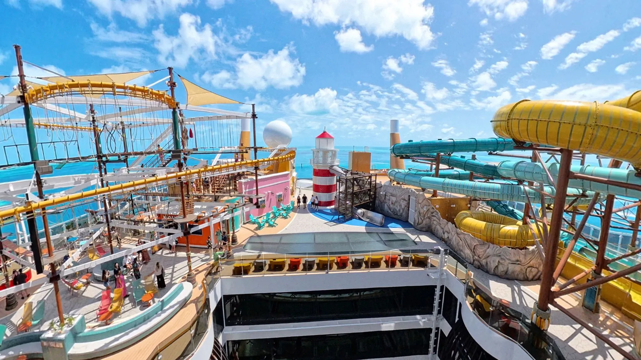 The massive Thrill Island sports deck boasts mini-golf, a sports deck, and the largest waterpark at sea, among other amusements.