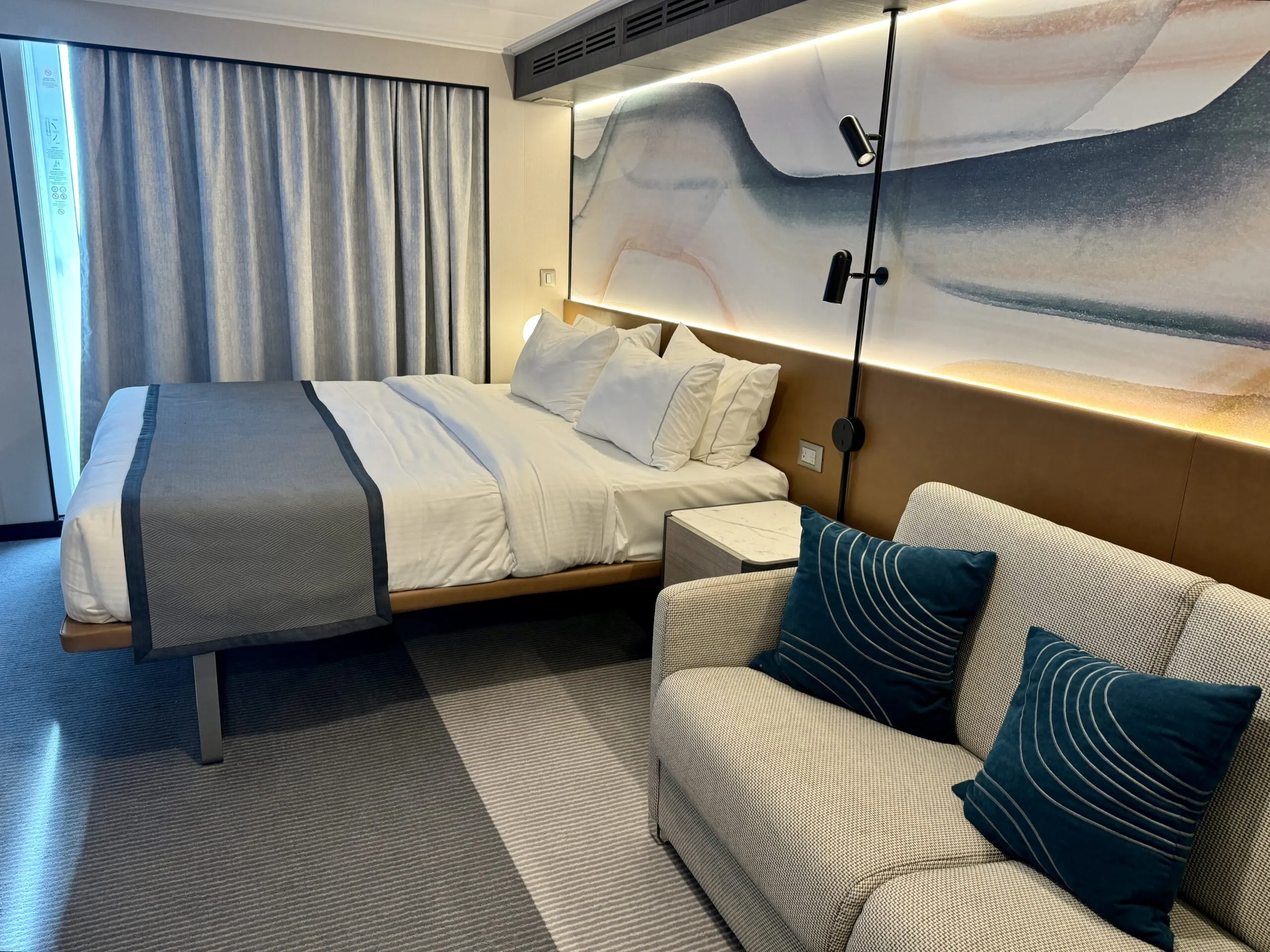 The staterooms boast ample closet space and multiple outlets, and USB ports are strategically placed at the desk and on both sides of the bed. The love seat provides a comfortable spot to unwind. The king-sized bed was comfy and easy to maneuver around during our cruise.