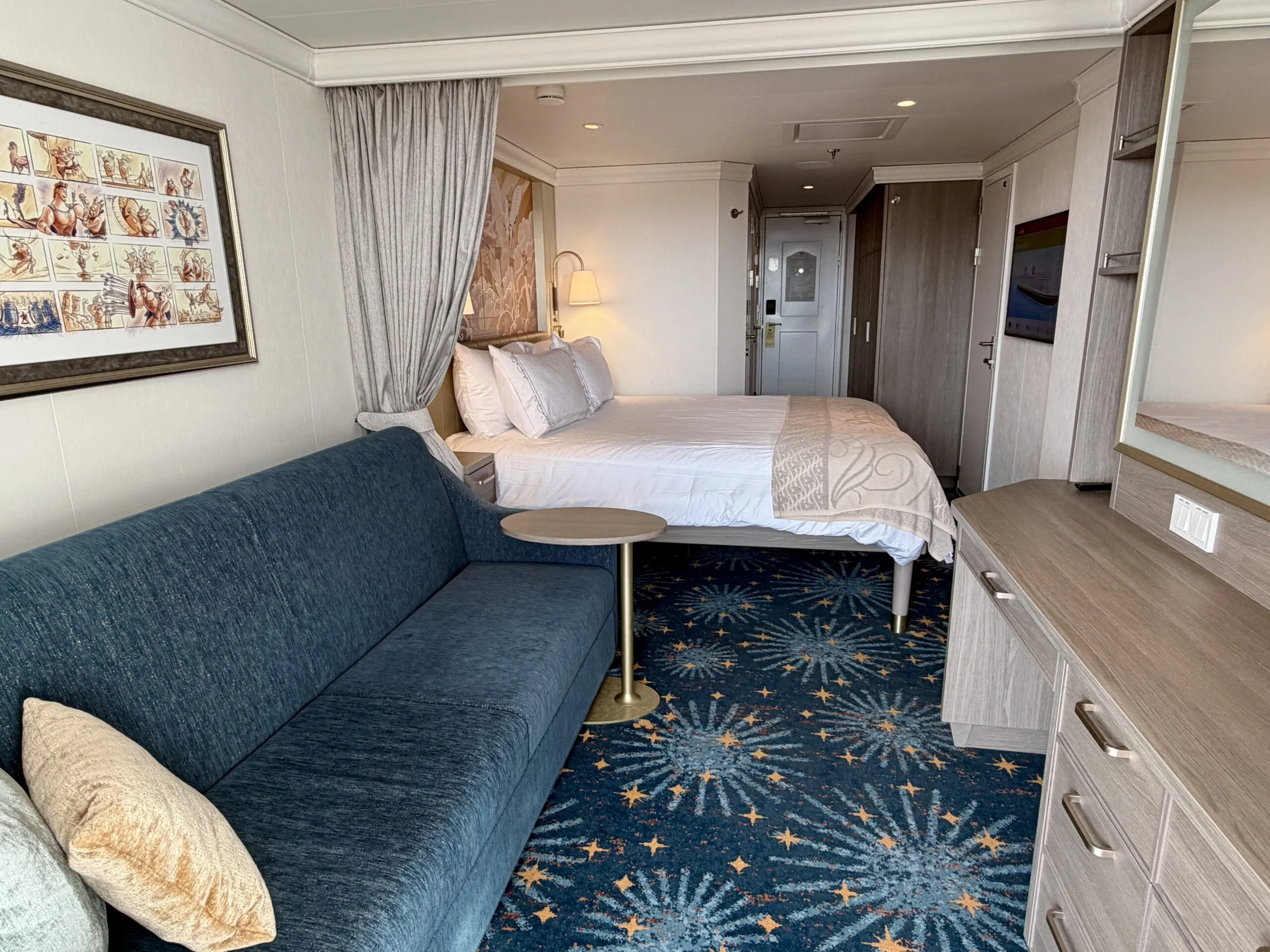 The sitting area is spacious by cruise ship standards with a comfortable sofa. The desk area offers plenty of workspace and storage, along with five total outlets. The bed area provides additional USB and USB-C outlets as well as power outlets.