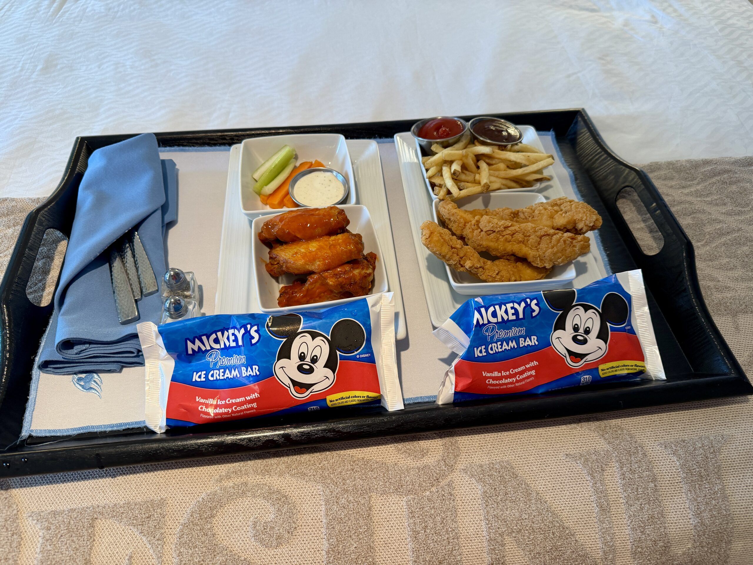 Disney also offers complimentary 24-hour room service, which is a thing of the past on most other cruise lines. This is a nice convenience that includes chicken wings and Mickey ice cream bars delivered to your stateroom.