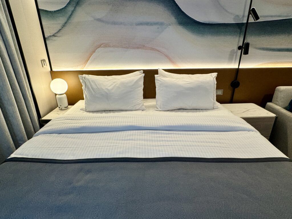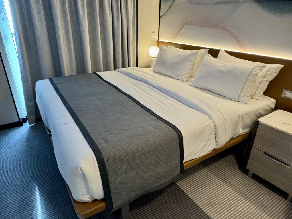 The main cabin area of this Norwegian Aqua balcony room makes efficient use of space. The bed provided adequate comfort and we had no issues falling asleep after our long days and nights on the ship.