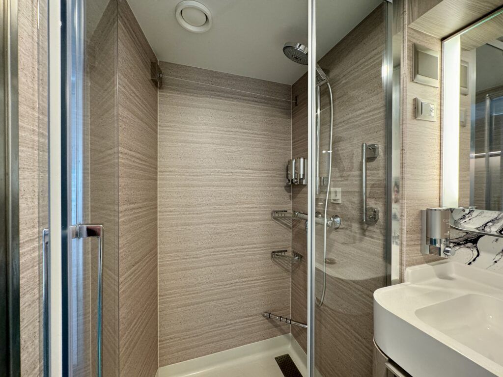 The shower is rectangular with a glass door. It includes a shampoo dispenser and shower gel dispenser along with two small shelves and a shave bar. The shower head also has adjustable spa-like features. The overall design makes it feel roomier than standard cruise ship showers.