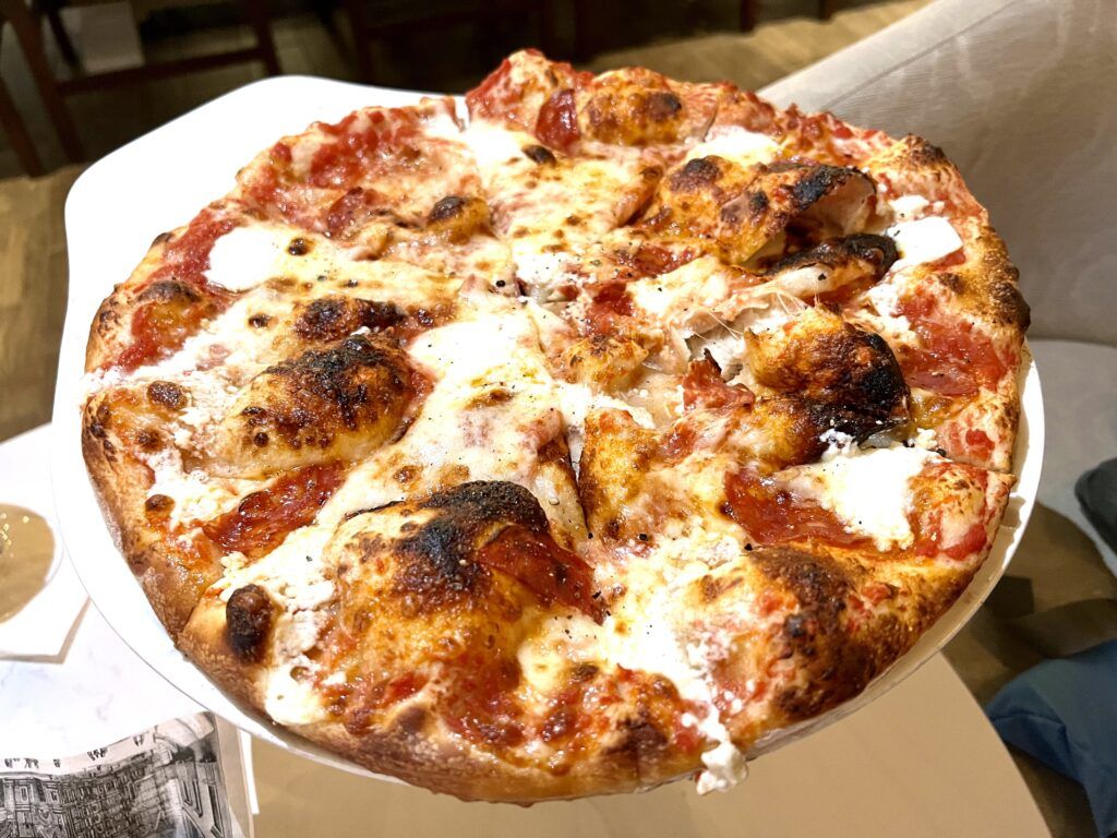 The calamari was fresh and crisp, served with a tangy marina sauce. The giant meatball was a combination of beef and pork. Stuffed with mozzarella cheese and topped with parmesan cheese, it was a rich, flavorful combo. The pizza and salad were equally delicious.