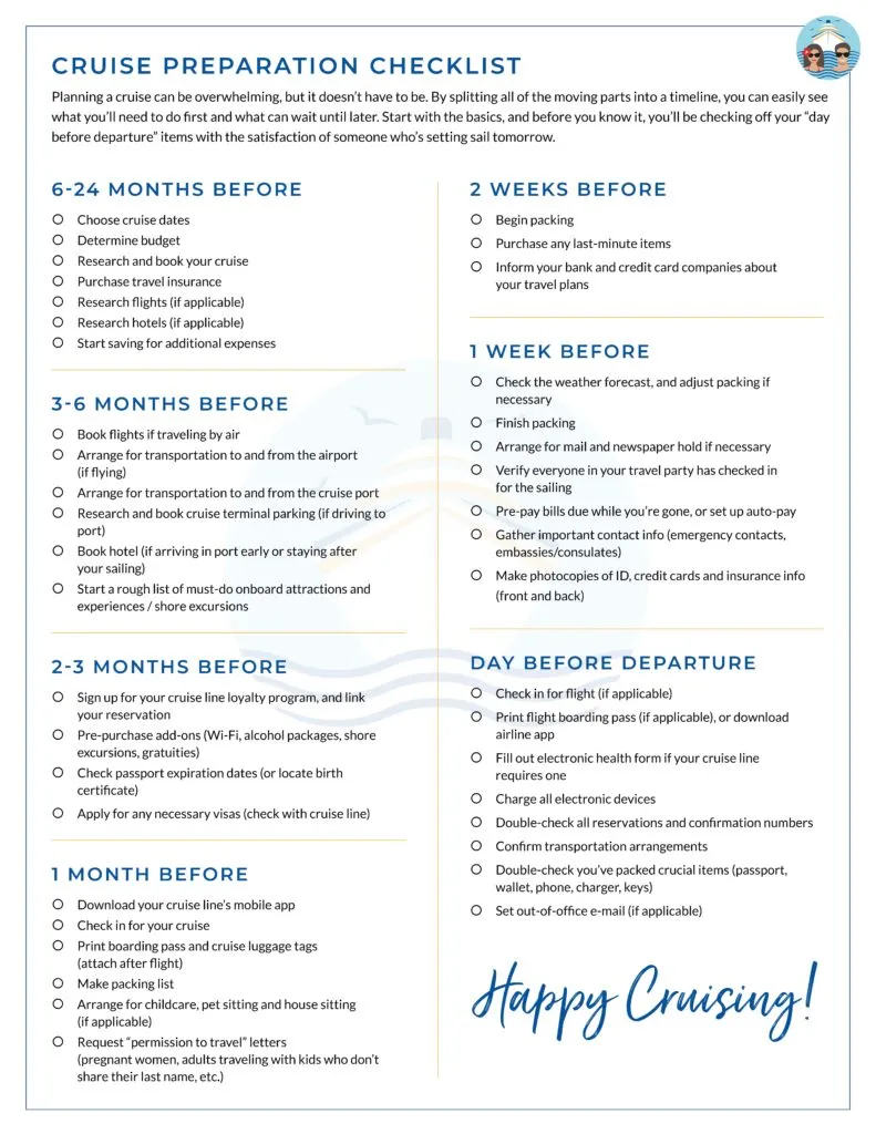 We’ve condensed this entire article into an easy-to-use printable pre-cruise checklist so you can make sure you don’t forget a single crucial step in the countdown to your cruise.