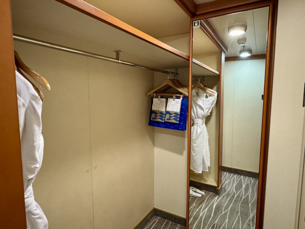 Although, there is one benefit to this stateroom design— the larger-than-typical cruise ship closet. The full-length closet and additional storage shelves behind the mirror offer more than enough space. Your daytime outfits, outerwear, and nighttime attire will all fit nicely in these accommodations.