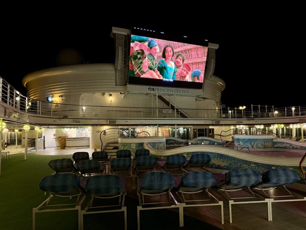 One thing Princess Cruises is known for though is Movies Under the Stars. In the evenings, the pool deck regularly played a variety of family-friendly movies, like Snow White and Wicked.