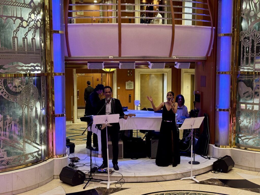 Along with the nighttime game shows, several venues offered live music. The Wheelhouse Bar was often home to a solo guitarist or one of the two onboard duos. Two piano players tickled the ivories at Crooners Bar. The rock band NeoFunk was everywhere, from being part of piazza parties to performing for some of the game shows.