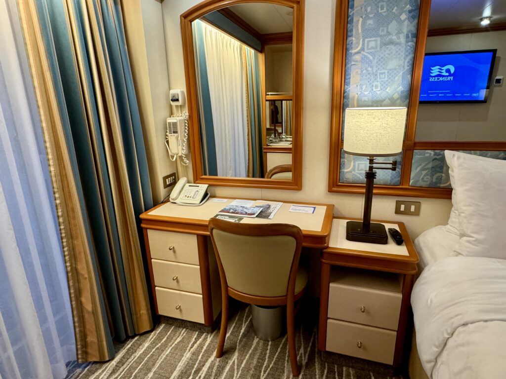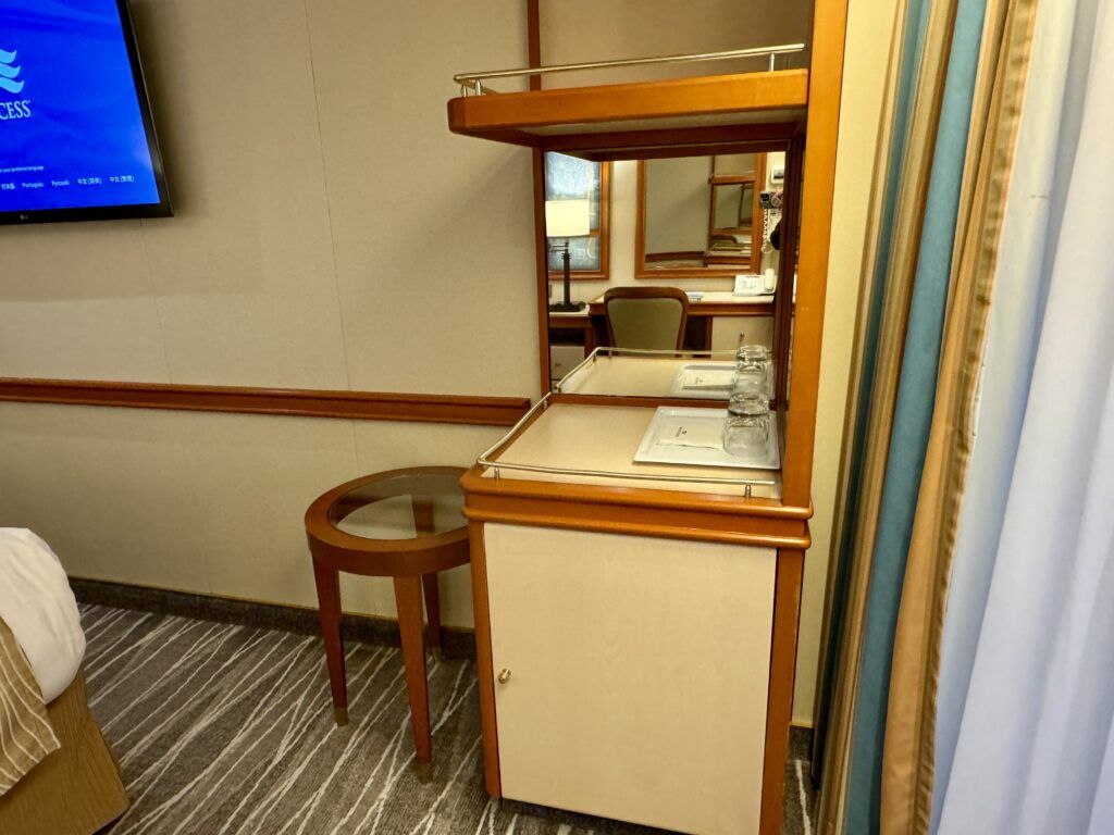 If you are a frequent Princess cruiser, you will be very familiar with the cruise cabin layout. Immediately entering our cabin, the bathroom was on the right, followed by a walk-in closet and some additional shelves. Past the closet, the bed was on the midship wall, facing forward. There was then a small desk on the right and cabinetry across the way with the refrigerator.
