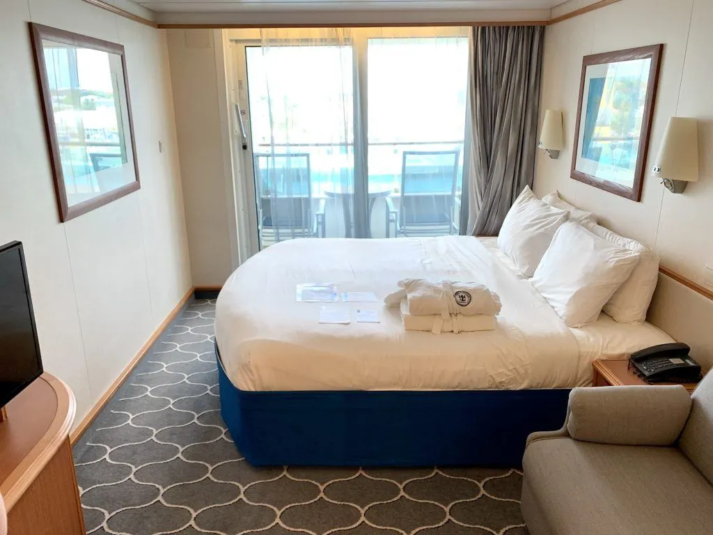 The cabin had the typical Royal Caribbean setup with our bed located in front of the balcony door. This familiar, welcoming accommodation made us feel right at home.