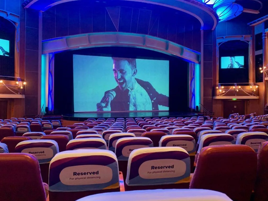 The capacity in the theater is greatly reduced. Royal Caribbean has entire rows blocked off. Even within a row, only two guests are allowed to sit next to each other. Larger parties will be asked to break off into pairs.